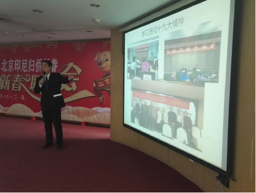 北京印尼归侨联谊会会长叶小平在联谊会上致词,他结合PPT回顾了联谊会2017年的工作:一、学习贯彻十九大精神及我会党建活动;二、服务侨联,参加侨联的各项活动;三、联谊会的活动与工作;四、各分会的活动;五、海外友好互动。在谈到联谊会的工作时,他着重介绍了我会走访了我会会员居住的12个区的侨办及侨联,将早期归国的老归侨共1164人的基本情况提供给他们。对我会2018年的工作他指出主要有以下几点:一、深入学习领会十九大的精神做好党建工作;二、及时跟踪完善老侨的信息资料,更好地与各区的侨办、侨联对接,借助政府职能的力量,使老侨 、困侨、病侨、空巢家庭有人知、有人管,为侨做好服务;三、组织有进住养老院意愿的侨友参观大兴养老院;四、组织回顾改革开放40周年座谈会;五、为2019年我会成立30周年做准备,继续发掘稿件充实华侨史料图书。